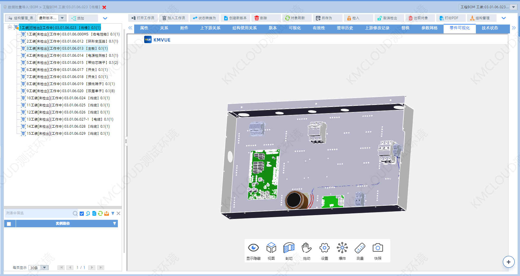 基于CAD设计模型,KMPLM CLOUD实现数据驱动的EBOM自动生成,智能识别零部件层级与装配结构,支持属性自动映射与继承,完成从“设计BOM”到“制造BOM”的无缝转换。这一过程不仅极大提升数据流转效率,更构建了企业统一的产品结构数据源,为工艺规划、供应链协同与生产执行提供“单一数据源”支撑,根治数据不一致问题。